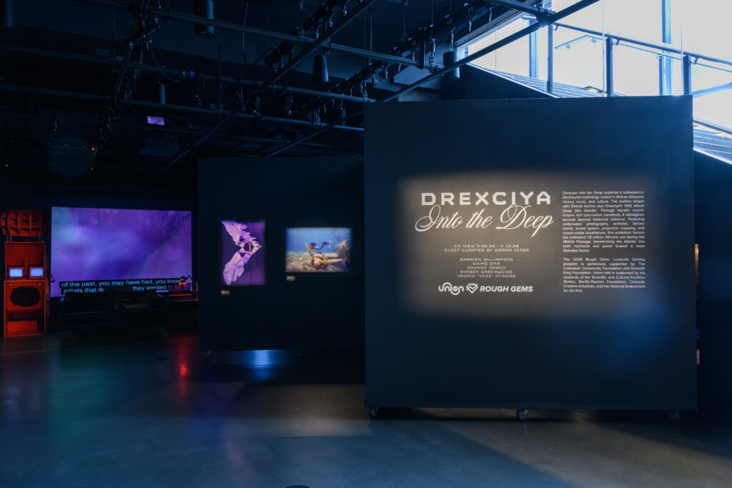Submerged in Sound is presented as part of Union Hall’s annual Rough Gems curatorial training program, with Drexciya: Into the Deep as the first of three exhibitions. The exhibition explores a subaqueous Afrofuturist mythology rooted in African diasporic history, music, and remembrance. Originating from the Detroit techno duo Drexciya and their 1992 album Deep Sea Dweller, the Drexciya mythos unfolds through aquatic soundscapes, album art, and speculative narratives that reimagine survival beyond historical violence.